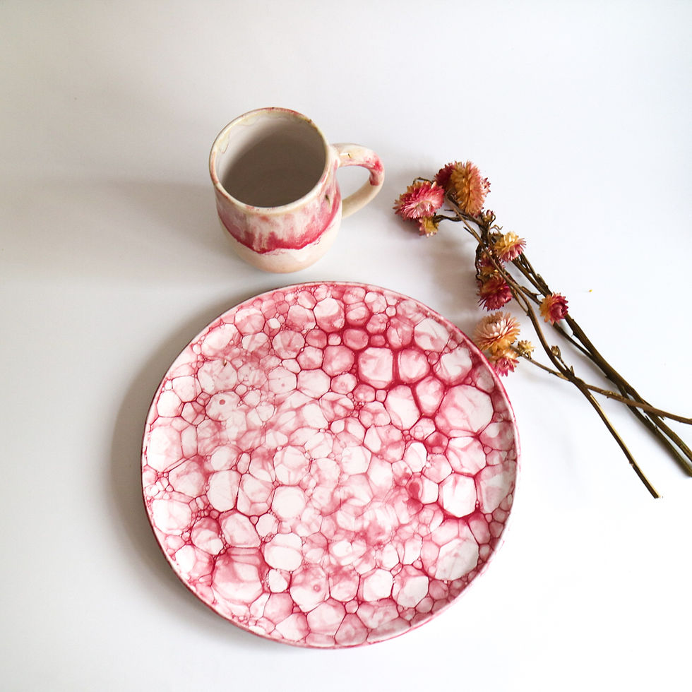 Handmade Stoneware Ceramic Small Dish – Soft Pink Glaze with Black Flower Design